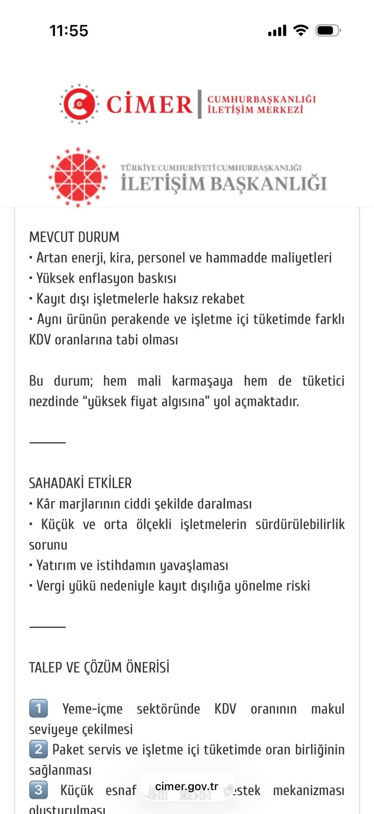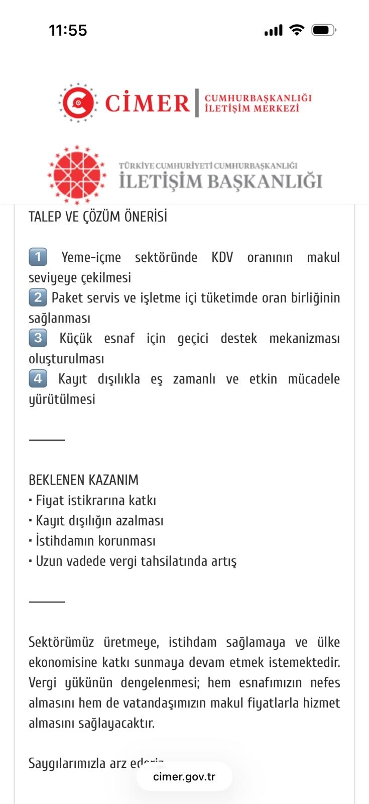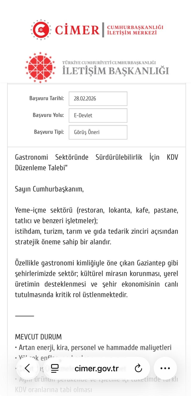 Yeme-içme sektörümüzde yaÅŸanan KDV oranlarına iliÅŸkin sorunları iletmek üzere CİMER üzerinden gerçekleÅŸtirdiÄŸimiz baÅŸvuruya resmi cevap tarafımıza ulaÅŸmıştır.