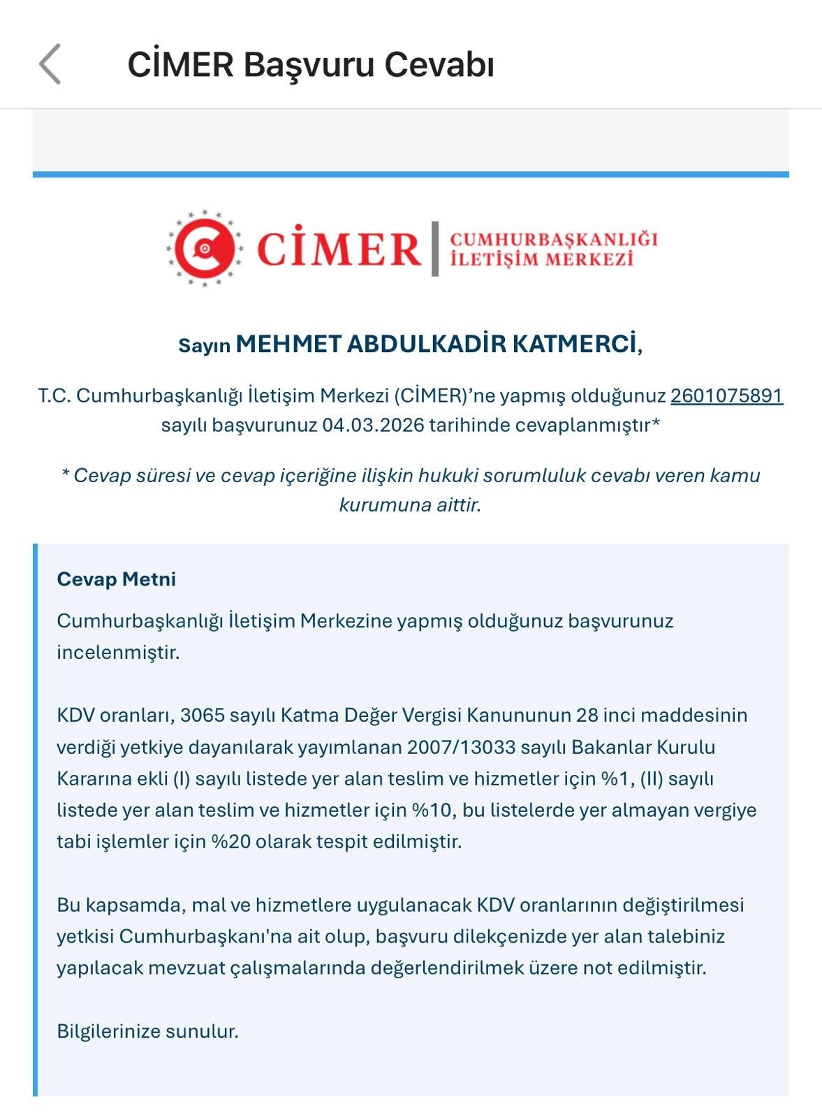 İlgili cevapta; KDV oranlarının 3065 sayılı Kanun ve yürürlükteki mevzuat çerçevesinde belirlendiÄŸi, oran deÄŸiÅŸikliÄŸi yetkisinin CumhurbaÅŸkanlığı makamında olduÄŸu ve dile getirdiÄŸimiz taleplerin yapılacak mevzuat çalışmalarında deÄŸerlendirilmek üzere not edildiÄŸi ifade edilmiÅŸtir.