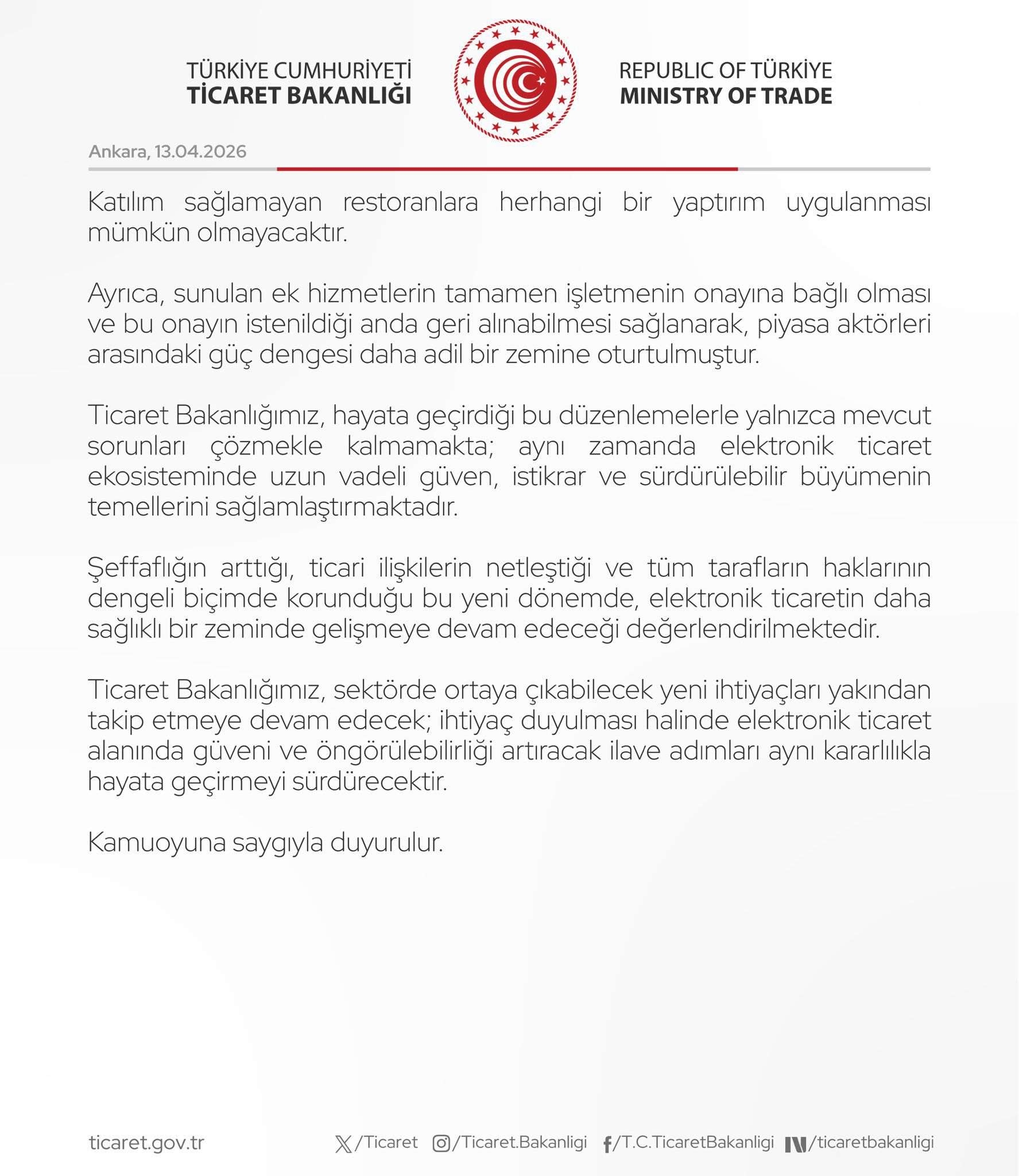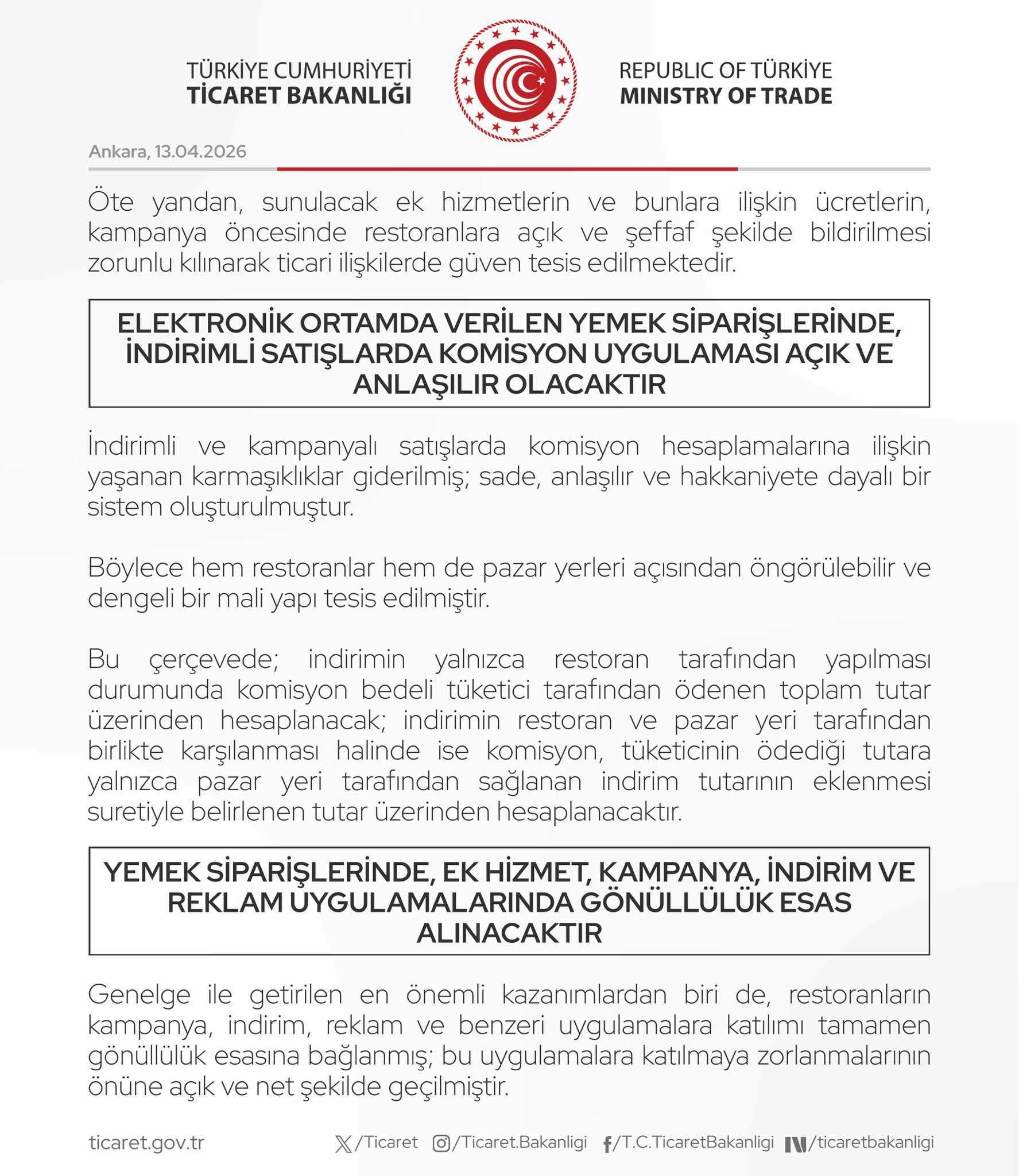 Restoranların kampanya, indirim, reklam ve benzeri uygulamalara katılımı tamamen gönüllülük esasına baÄŸlanmıştır. Katılım saÄŸlamayan iÅŸletmelere herhangi bir yaptırım uygulanamayacaktır.Sunulacak ek hizmetler ve bu hizmetlere iliÅŸkin ücretler, önceden açık ve ÅŸeffaf ÅŸekilde bildirilecek olup, iÅŸletmelerin onayı olmadan herhangi bir uygulama yapılamayacaktır. Ayrıca verilen onay istenildiÄŸi anda geri alınabilecektir. İndirimli ve kampanyalı satışlarda komisyon uygulamaları daha ÅŸeffaf ve anlaşılır hale getirilmiÅŸtir. Böylece iÅŸletmeler açısından belirsizlikler ortadan kaldırılmıştır.Komisyon hesaplamalarında hakkaniyet esas alınmış, özellikle indirimin kim tarafından karşılandığına göre adil bir sistem getirilmiÅŸtir.Tüm bu düzenlemeler ile sektörümüzde daha dengeli, öngörülebilir ve güvenilir bir ticari yapı oluÅŸturulması hedeflenmiÅŸtir.Bu geliÅŸmelerin tüm üyelerimize hayırlı olmasını diler, süreci yakından takip etmeye devam edeceÄŸimizi bilgilerinize sunarız.
